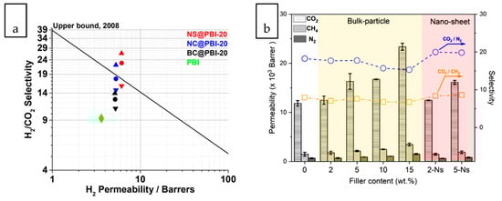 Realizing the intrinsic benefit of anisotropic material, there has been increasing interest over the last few years in using lamellar zeolite and MOF as the nanofiller of nanocomposite membranes [118,119,120]. These studies confirmed the role of 2D lamellar morphology to render a perpendicular pore orientation which can shorten diffusion paths for the desired components but increase the tortuosity of the undesired components. Kang et al. correlated the H2/CO2 separation performance of MMM with the dimensional properties of a small pore MOF nanofiller, namely [Cu2(1,4-naphthalene dicarboxylate)2(1,4-diazabicyclo[2.2.2]octane)]n in the form of bulk crystal, nanocube, and nanosheet [121]. The nanosheet MOF exhibited the highest CO2 uptake owing to narrow MOF channels which has provided homogeneous sorption sites for CO2. Compared to bulk crystal MOF, nanocube MOF distributed more uniformly throughout the matrix due to the reduced particle size. Nevertheless, MMM containing nanosheet MOF has exhibited the highest H2 permeability and H2/CO2 selectivity, as depicted in Figure 3a. The main reason lies in the partial stacking of MOF nanosheets, due to the shear force imparted during membrane casting, which serve as CO2 barriers to enhance the sieving efficiency. A relatively new type of MOF, MUF-15 in bulk crystal and nanosheet geometries was introduced into a PIM-1 polymer matrix for CO2 separation [122]. The MUF-15 nanosheets offered large interfacial contact area between the polymer and filler phases to enhance compatibility while interfacial voids were formed when MUF-15 bulk crystal was used. As a consequence, CO2/CH4 selectivity enhancement was achieved with the former nanofiller, as depicted in Figure 3b.