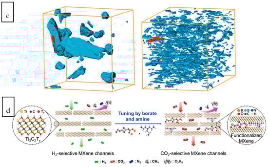 Facilitated transport membrane is important for gas separation as it enables excellent permeability and selectivity for a targeted gas through the incorporation of a carrier agent with a special affinity toward a target gas component. In this context, the 2D nanosheet and 3D nanoporous crystals are beneficial as the interlayer spacing between nanosheets and porous framework structures can readily host the carrier agents. An interesting chemical functionalization has been demonstrated by Shen et al. to tune the gas selectivity of MXene nanofilm horizontally aligned on a substrate [124]. As illustrated in Figure 3d, the interlocking of borate and polyethylenimine within the nanoconfined MXene nanosheets reduced the interlayer spacing. The chemical functionalization of CO2-philic borate which act as CO2 facilitated transport carrier transformed the nanoconfined layers of Mxene from diffusion-controlled to solution-controlled channels. As a result, the membrane was tuned from a H2-selective to CO2-selective membrane. Water plays an important role in CO2 facilitated transport. When incorporated into the polymer matrix, 2D nanosheets with large surface area-to-volume ratio contributes vast space to redistribute the water domain present in the humidified membrane such that water-rich domains are available throughout the matrix to facilitate the sorption of CO2 [126]. The nanosheets can also effectively disrupt and induce reorientation of polymer chain packing which in turn increased gas diffusion.