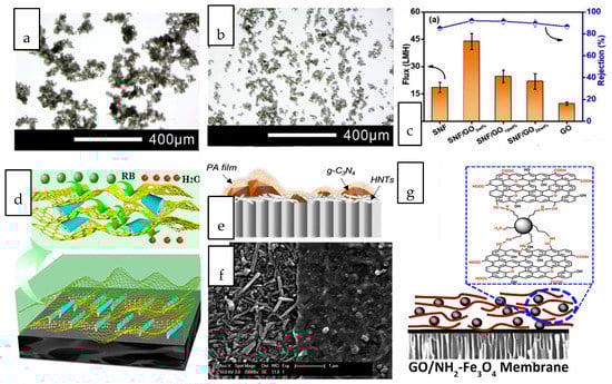 Optical images of (a) carbon nanotube (CNT) and (b) CNT/GO dual nanofiller dispersed in aqueous-based solution. (c) nanocomposite membranes incorporated with SNF/GOx exhibited drastically improved Na2SO4 rejection and flux for the SNF, GO, and membranes [156] (d) conceptual illustration of water transport path and nanocapillary network jointly created by porous reduced graphene oxide/halloysite nanotubes (PRGO/HNTs) (RB: Reactive Black) [157] (e) Schematic illustration of cross section and (f) surface image of TFN membrane incorporated with g-C3N4/HNT. The left part with the PA scraped off revealed the orientation of HNT [158], (g) Schematic illustration of NH2-Fe2O3 intercalated GO nanosheets [159].