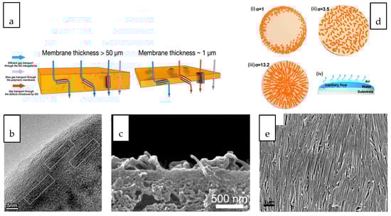 Tubular and sheet-like nanomaterials, when oriented in different directions within the polymer matrix, result in different gas transport behaviors. As depicted in Figure 6a, for composite membranes with a relatively thick selective layer, GO nanosheets aligned perpendicular to the membrane surface facilitated the diffusion of gas molecules through the interlayer spacing of nanosheets while that aligned parallel to the membrane surface lengthens the pathway for the passage of gas molecules although the gas molecules still preferably transported through the GO interlayer spacing [183]. However, despite this ideal orientation, the practicability of the membrane should also be taken into consideration. Formation of thin (~1 µm) selectively layer that is preferable for a practical separation process may not favour the vertically or randomly oriented GO nanosheets considering the defects and voids created. Zhang et al. aligned GO horizontally in the thin PEBAX selective layer (Figure 6b) by taking the advantage of shear effects during dip-coating process [184]. Although the tortuosity of the gas transport pathway has been increased upon the addition of GO, the parallel-aligned GO laminates provide size-selective and fast gas transport channels without creating defects within the selective layer. Compared to the randomly oriented and neat polymeric membrane, the nanocomposite membrane with parallel-aligned GO demonstrated improved CO2 permeance without compromising the CO2/N2 selectivity.