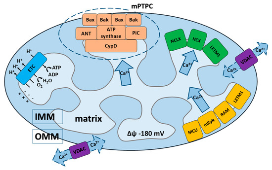 Compared to the OMM, the IMM exhibits a fundamentally higher selectivity for anions and cations thanks to the presence of highly-specific and different protein machinery in the IMM. The key transporters that determine Ca2+ uptake by mitochondria through the IMM until recently were unclear. It is now believed that the transport of Ca2+ through the IMM is accomplished by a group of mitochondrial Ca2+ uptake transporters. Basically, three main mechanisms of Ca2+ influx have been proposed (Figure 1): (1) a mechanism that requires an electrogenic mitochondrial Ca2+ uniporter multi-protein complex (MCU complex); (2) a so-called rapid mode (RaM); (3) a mechanism requiring the mitochondrial ryanodine receptor (mRyR) [7,10,12,13,38]; and (4) additionally, leucine zipper-EF-hand containing transmembrane protein (LETM1) could represent another Ca2+ influx mechanism, but its role is still under discussion [61,62,63,64].