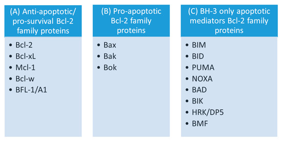 The Bcl-2 family comprises numerous members, categorized into 3 groups according to the total number of BH domains and their role in apoptosis (Figure 2): (1) pro-survival (i.e., anti-apoptotic) Bcl-2 proteins; (2) pro-cell death (pro-apoptotic) Bcl-2 proteins; and (3) BH3-only proteins [3,169,187,206,207,208,209,210,211].