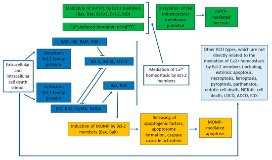 mPTP-mediated necrosis and mitochondrial-mediated apoptosis are two types of RCD that are mediated through the interconnection of the mitochondrial transport of Calcium and Bcl-2 proteins (Figure 3) [3,214]. Although both of the biochemical mechanisms and morphological changes of apoptosis and necrosis vary significantly, both mechanisms can be characterized as the “apoptosis-necrosis continuum” with a shared biochemical network [292]. Bcl-2 proteins are crucially involved in these processes by working as the key regulators of the MOMP-mediated pathway of apoptosis. This includes MOMP, primarily induced by direct binding interactions between Bcl-2 proteins (Figure 3), leading to irreversible release of intermembrane space proteins, and subsequent caspase activation, which culminates in biochemical and morphological apoptotic changes, and apoptosis itself [218,242,289,293].