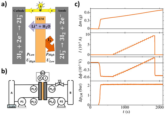 Figure 1c shows a set of raw data from a single experiment done with Nafion212 and 1 M LiI/I2 solution. The system is stabilizing until 250 s where a pressure difference of ∼2 bar is applied across the flow cell. This is followed by a sudden increase of of around 400 mg due to the pressure-induced membrane deformation. Afterward, a steady, linear increase related to pressure-driven permeation is seen. For a similar sudden change is observed and it settles within minutes at a constant value around −0.6 mV. This is a direct measure of the streaming potential coefficient: V Pa. Around 750 s the ramping of I is initiated and is seen as a stepwise increase of both I and with time. It is noted that when reaches 0 the EKEC system has reached its maximum streaming current. When , electrical power is supplied to the flow cell and the system formally operates as a pump. The additional pumping through the membrane has the same direction as the pressure-driven flow. For each 60 s plateau a linear regression is performed and the volume flow through the membrane is calculated as: . For these calculations it is assumed that the permeated solution has the density g cm. For I, , and the average value for each plateau was considered for further analysis.