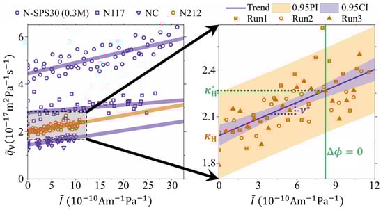 Direct measurement of the electroviscous effect shown as the normalized volumetric membrane flow () versus normalized electrical current () through the external electrical load. Left: Data for 30 wt% SPS in Nafion (N-SPS30: purple circles) in 0.3 M LiI, and for Nafion117 (N117: purple squares), Cast-Nafion (NC: purple triangles), and Nafion212 (N212: orange circles) in 1 M LiI. Right: Magnification of the N212 data performed as three repeated experiments under the same conditions. Solid lines are linear fits with . Light blue area represents the 95% confidence interval. Light red area is the 95% prediction interval for the data points. Green vertical line illustrates the -value where the electrical potential across the membrane. The trend-line value at this point equals the intrinsic hydraulic permeability coefficient (), the y-axis intercept equals the hydraulic permeability coefficient (), and the slope equals the negative streaming potential coefficient ().