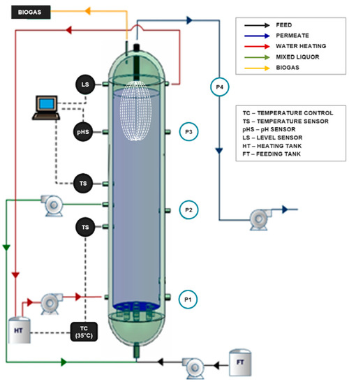A lab-scale AnMBR with submerged ultrafiltration membrane configuration of ascending flow was used in this study (Figure 1). The AnMBR is made of stainless steel with a volume of 31.4 L, 1 m height, and 0.20 m of diameter. The reactor has three sampling points for the sludge (P1, P2, and P3) located at different heights (0.145 m, 0.445 m, and 0.75 m, respectively). The permeate outlet point (P4) is located on the top.