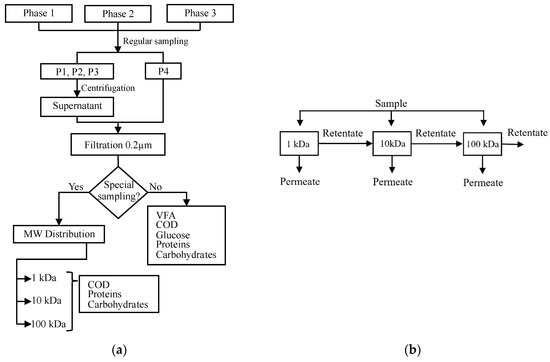 (a) Sampling methodology followed during the three phases. (b) The parallel configuration of Amicon® stirred ultrafiltration cells used for soluble microbial product (SMP) molecular weight (MW) distribution.