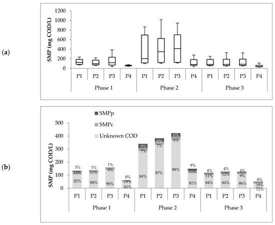 The SMP difference between P3 and P4 for all three phases shows that the membrane can retain or degrade some SMPs, significantly decreasing the percentage of unknown COD. One possible cause that may explain this process is the membrane fouling caused by the pore blockage of these organic compounds that make up the unknown COD, both BAPs and UAPs, as proposed in the fouling model described by Ni et al. [13].
