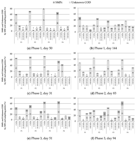 In phase 1, the intermediate fraction became important at every sampling point, and by the end of the run (day 144 in Figure 4c), the smallest MW fraction decreased to 24% (see P2) of the total SMP. SMP with higher MW (i.e., >10 kDa) is accumulated at an increasing operational time due to its non-biodegradable properties [13,17], and consequently, they become the most important fraction of soluble organic matter [13].