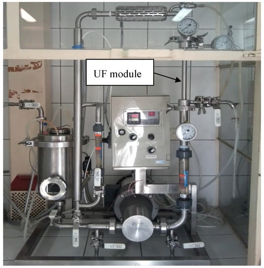 The experiments were performed in a continuous mode of operation in a pilot-scale apparatus (INTERMASZ, Września, Poland) equipped with a cross-flow UF membrane module (Figure 1). The scheme of the pilot-scale installation was presented and described in our recent study [].