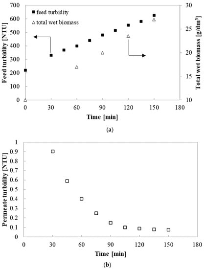 In turn, the efficiency of removal of macromolecular substances was estimated based on measurements of the feed and permeate turbidity. Figure 2 shows the reported values of the feed turbidity and total wet biomass (a) and permeate turbidity (b) during the run of UF process performed under TMP and Q equal to 0.2 MPa and 300 dm3/h, respectively. At the beginning of the process, the feed turbidity was equal to 130 NTU. Along with the duration of the purification process, it increased, and in the end of the process, it was equal to 625 NTU. The observed increase can be justified by the fact that the UF process led to the broth thickening. Indeed, the total wet biomass during the investigated process increased from 10.01 to 27 mg/dm3. In contrast, the turbidity of permeate decreased significantly with the experiment run. It has been found that at the beginning of the process, it was equal to 0.9 NTU, and after 60 min, it was reduced twice. In turn, in the end of the process, it was lower than 0.1 NTU. It is related to the fact that with increasing the feed turbidity, the cake layer formed by the biomass and other broth components was thicker and acted as a second membrane []. Thus, it improved the permeate quality through a higher efficiency in removing macromolecular substances. This phenomenon has also been observed in our recently published study [], where the cross-flow microfiltration (MF) of 1,3-PD fermentation broths has been investigated.