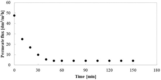 Changes of permeate flux during the UF process under TMP = 0.1 MPa and Q = 200 dm3/h.
