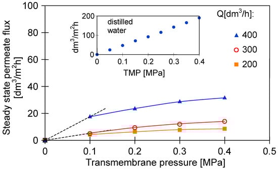 Figure 4 shows the impact of TMP and Q on the steady-state permeate flux during the UF process. For instance, increasing the TMP from 0.1 to 0.2 MPa led to an increase in the steady-state permeate flux from 4.25 to 6.34 dm3/m2h under the feed flow rate equal to 200 dm3/h. A further increase in TMP to 0.3 and 0.4 MPa allowed increasing membrane performance to 7.70 and 8.55 dm3/m2h, respectively. In turn, performing the UF process under 400 dm3/h and TMP of 0.1 MPa allowed to obtain the steady-state permeate flux equal to 17.79 dm3/h, whereas under the TMP of 0.4 MPa, the membrane was characterized by the performance of 31.78 dm3/m2h. These results indicate that TMP affects the performance of the membrane used in the presented experiments. Permeation fluxes are clearly higher for the higher TMP, which is supported by the greater hydrodynamic driving force toward the membrane surface. The results obtained in the present study are in agreement with those presented in References [,,,,,], where increase of the permeate flux with increasing of TMP during UF of various fermentation broths has been reported. However, it is worth noting that in the present study, the membrane flux increased with increasing TMP in a near-linear relationship until a limiting flux value was reached. Then, the membrane flux increased slightly. It has been determined that the value of the critical flux depends on the feed flow rate. It was equal to 4.25, 9.43 and 17.79 dm3/m2h under Q of 200, 300 and 400 dm3/h, respectively. Since the obtained relation between permeate flux and TMP is below that reported for the pure water, limiting fluxes noted during all performed experiments are classified as a weak form of the critical flux []. This type of critical flux has also been reported in previous studies [,,,,], where low-pressure membrane processes (MF and UF) have been used to perform the pre-treatment of fermentation broths.