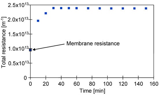 It has been found that during all performed UF experiments, the total filtration resistance to transport of permeating solvent gradually increased until the steady-state flux has been achieved. This phenomenon was caused by the concentration polarization and membrane fouling. Figure 6 illustrates the evolution of the total resistance, Rt, during the UF process performed under TMP equal to 0.1 MPa and Q of 400 dm3/h. It has been noted that in the quasi-steady-state period of the process performed under the above-mentioned conditions, the Rt was equal to 2.38 × 1013 m−1.