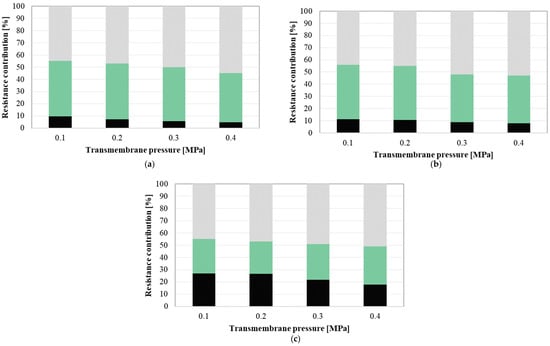 Resistances contribution as a function of transmembrane pressure. Q (dm3/h): (a) 200, (b) 300, (c) Q = 400 irreversible fouling, reversible fouling, membrane.