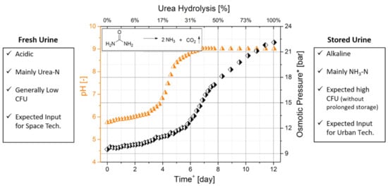 From fresh to hydrolysed. The change in pH and osmotic pressure during urea hydrolysis in the urine. * OLI Studio Analyser software was used to estimate the osmotic pressure based on the chemical analysis of the urine solution. Adapted from Volpin (2019) [].