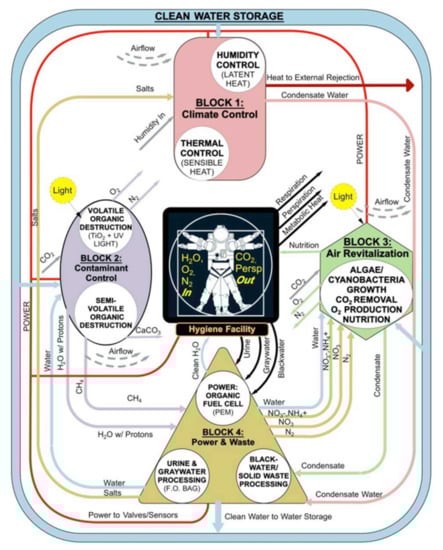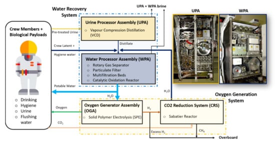 Schematic of the water recovery and management architecture for the US International Space Station (ISS) segment. Adopted and modified from [,].
