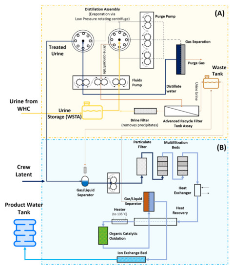 Schematic of the Urine Processor Assembly (UPA) (A) and the Water Processor Assembly (WPA) (B) installed at the ISS. Adapted and modified from [,].
