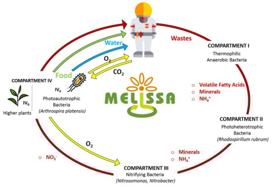 The Micro-Ecological Life Support System Alternative (MELiSSA) loop. Adapted from [].