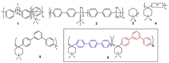 Miyatake et al. introduced a new family of quaternized poly(arylene perfluoroalkylene)s, (QPAFs) 1 (Figure 1), having perfluoroalkylene groups and aromatic rings, avoiding heteroatom linkages in the polymer backbone [26]. Even though these kinds of molecular varieties have shown better stabilities in AEMs, the quaternary ammonium (QA) cations placed in the typical benzylic positions have remained a problem, due to loss of the cation as a conducting head group.
