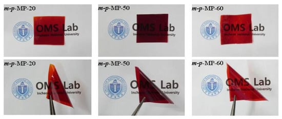 Photographs of the m-p-MP-20, m-p-MP-50, and m-p-MP-60 copolymer membranes.