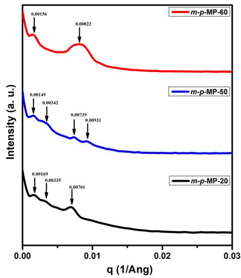 Small angle X-ray scattering (SAXS) profiles of the m-p-MP-20, m-p-MP-50, and m-p-MP-60 copolymer membranes.