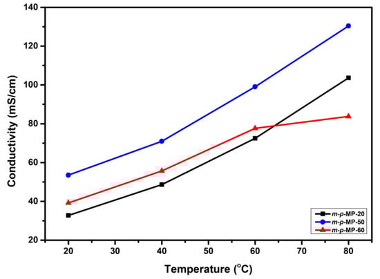 Conductivity profile for the anion exchange membrane (AEM) samples m-p-MP-20, m-p-MP-50, and m-p-MP-60.