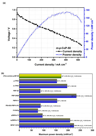 (a) H2/O2 single cell performance data of the m-p-MP-50 membrane in 95% RH at 60 °C and (b) maximum power density values of recently reported rigid polymer-based AEMs, compared with the m-p-MP-50 membrane.