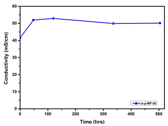 Aside from the physical stabilities such as mechanical and thermal stability of the AEMs, chemical stability in an alkaline condition (or alkaline stability) where AEMFCs operate is also very important to determine the duration of fuel cells. The chemical stability of the m-p-MP-50 membrane in an alkaline condition was, therefore, examined by measuring its hydroxide conductivity in a 1M KOH solution at 80 °C for 500 h at a certain time interval in terms of its decrease over time (Figure 9). After a certain period, this membrane was taken out of the KOH solution and carefully washed with deionized water. The hydroxide ion conductivity was then measured at 20 °C. The increment of hydroxide conductivity was observed up to 48 h, and it was attributed to the complete conversion of the conducting head group, that is piperidinium, from the halide form to the hydroxide anion form [8,26]. After this point, this membrane showed conductivity loss less than 4% up to 500 h, indicating long-term chemical stability. The membrane also maintained its original flexibility even after the alkaline test. The combination of non-aryl ether (C–O) linkages and balanced conformational structure between linear para-phenyl and kink-structured meta-phenyl units in the polymer backbone, together with the piperidium conducting head groups, are the reasons for the excellent chemical stability of the m-p-MP-50 membrane.