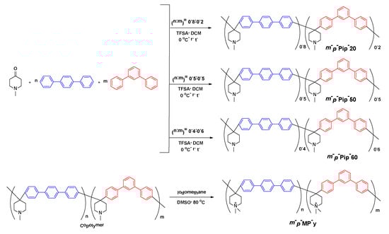 The synthesis of poly(meta/para-terphenylene-methyl piperidinium)s, m-p-MP-y, where y represents the percentage ratio of m-terphenyl content, was carried out by reacting m/p-terphenyl with N-methyl-4-piperidone through the acid-catalyzed Friedel–Crafts polymerization reactions [16,37,38], followed methylation of the piperidine. Three sets of copolymers with different m-terphenyl molar ratios of 20%, 50%, and 60% were reacted with N-methyl-4-piperidone to give copolymers with three different meta-terphenylene-piperidinium units, and the copolymers were termed m-p-MP-20, m-p-MP-50 and m-p-MP-60, respectively.