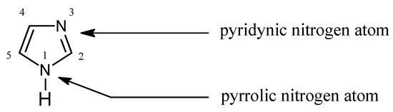 In Pearson’s theory [26] (HSAB), imidazole (Figure 1) is an intermediate base (pKa = 7.14 [27]) forming stable complexes with metal ions, a feature which is used for their separation [28,29,30,31,32,33,34]: