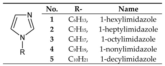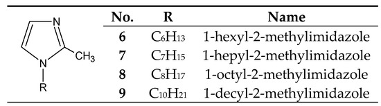 The alkaline, hydrophobic and complexing properties of imidazole can be affected by the introduction of various substituents into the ring, including alkyl ones. Alkylimidazole derivatives constitute a group of stable bases, whose properties (hydrophobic and alkaline) can be modified by changing the size of the alkyl group and its position in the imidazole ring [35,36,37,38,39,40,41,42,43,44,45,46,47,48,49,50,51,52,53]. The ability to separate metal ions was tested with the use of the following homologous series of alkylimidazoles: 1-alkylimidazoles [35,36,37,38,39], 2-alkylimidazoles [51,52,53], 1,2-dialkylimidazoles [37,40,41,44,45,46,47,48,49] and 1,4-dialkylimidazoles [41,42,43,44,50]. It has been proven [54] that, for individual homologous series, the basicity increases linearly as the number of carbon atoms in alkyl groups becomes larger. The primary parameter deciding about the usefulness of alkylimidazoles for the separation of metals in the process of (solvent, membrane, etc.) extraction involves their basicity.