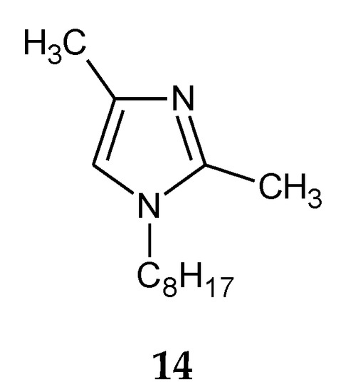The addition of two methyl groups into positions 2 and 4 of an imidazole ring highly increases the basicity of the molecule (Table 1). Among all homologous series of alkylimidazoles, 1-alkyl-2,4-dimethylimidazoles are the strongest bases. 1-Octyl-2,4-dimethylimidazole (14, Figure 5) was used to separate Zn(II) ions from a Zn–Cd–Ni mixture [61]. On the other hand, 1-decyl-2,4-dimethylimidazole (15, Figure 6) was used in the separation of Zn(II) from a Zn-Cd mixture [69].