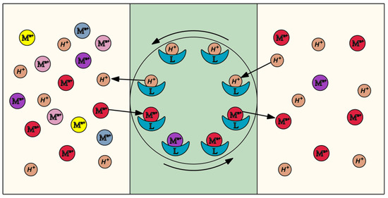 This results in the generation of a hydrophobic complex which diffuses across the membrane (Figure 8). The metal ion is released into the receiving phase and the carrier undergoes further diffusion across the membrane to the supplying phase. This process continues until the moment of reaching a complete chemical equilibrium of the system. The use of a carrier with an alkaline nature causes countertransport, which is accompanied by the transport of hydrogen ions in an opposite direction (Figure 8). The transfer mechanism remains in compliance with the mechanism specified in the literature [75,76,77].