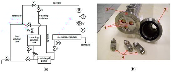 (a) Schematic of the plant used for MF tests: V1-9 ball valves; GV gate valve; P1,2 manometers, T thermometer; F flowmeter. (b) Membralox module: 1—ceramic multi-channel membranes, 2—stainless steel membrane housing, 3—module end-cup, 4—clamps.