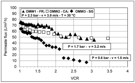 Figure 3 refers to the microfiltration tests and shows the behavior of permeate flux as a function of volume concentration ratio, VCR (i.e., the ratio between the volume of the initial feed and the volume of the final concentrate) for the three different pretreated (settled and filtered) OMWs. Gentle heating at 30 °C makes the feed (especially the OMW3-SG) more fluid with consequent reduction of the friction loss along the plant and improved performance of the centrifugal pump. The permeate flux at the beginning of the MF tests appears very close for the three OMWs, while increasing the VCR, OMWs behave differently, especially OMW3-SG. As far as OMW1-FR and OMW2-CA are considered, the permeate flux first slightly decreases and then tends to level off. With OMW3-SG, which contains a relevant amount of suspended materials, a strong and almost proportional decline of permeate flux with increasing the VCR is observed.