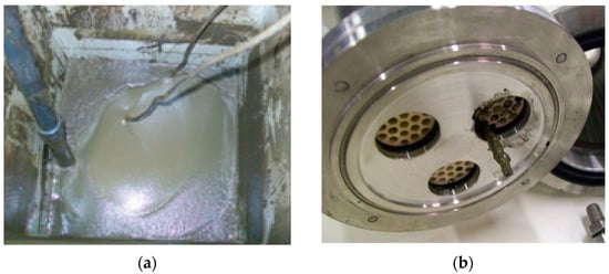 After a VCR = 2.1, the high viscosity of the concentrated OMW3-SG (Figure 4a) considerably reduces the performance (head and flow rate) of the centrifugal pump, thus the fluid velocity through the membrane channels is progressively lowered and membrane channels begin to plug. The permeate flux first falls and then continues the decrease slowly. Immediately after VCR = 2.85, a sudden increase of the pressure occurred and the pump reached its shut-off pressure. The test had to be stopped immediately and it was necessary to use a metal probe to unclog membrane channels (Figure 4b).