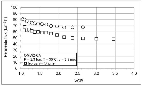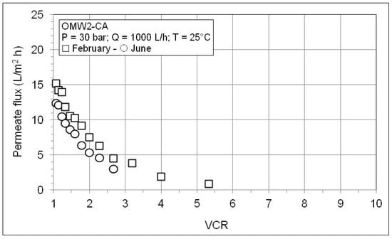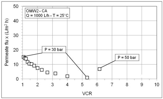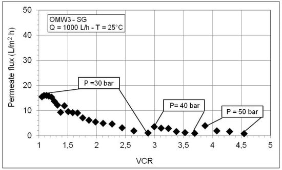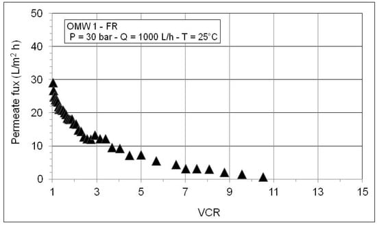 The results of the RO concentration test carried out with the MF permeate of OMW1-FR are shown in Figure 5. By increasing the VCR, the permeate flux decreases first rapidly and then slowly until reaching VCR = 10.5, a value (around 1 L/(m2∙h)) ca. 30 times lower than that of the initial flux (VCR = 1). The observed flux decline with increasing VCR can be ascribed to the increase of the osmotic pressure of the feed, as well as concentration polarization and fouling phenomena.