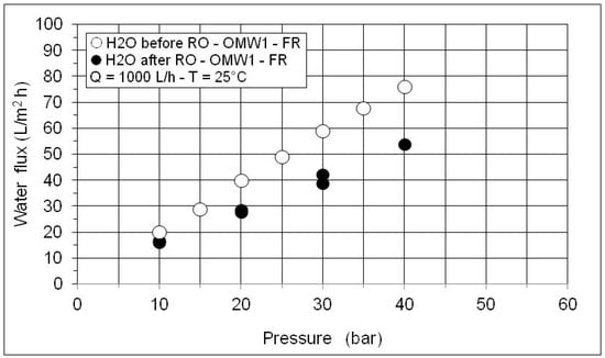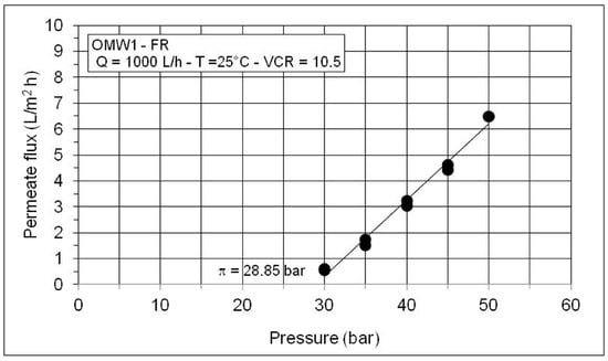 The osmotic pressure of the concentrated solution (VCR = 10.5) can be estimated by measuring the permeate flux at increasing pressures and a constant feed concentration as shown in Figure 6. The differences in pure water flux (Figure 7) measured before and after OMW treatment are connected to the membrane fouling. Only a moderate cleaning with a NaOH solution (pH = 11) at 40°C was sufficient for eliminating fouling and achieving FRR around 100%.