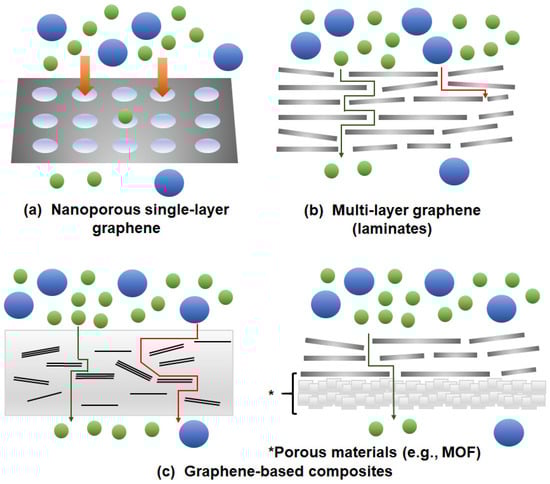 Possible membrane configurations that can be developed with the use of graphene: (a) Nanoporous single-layer graphene, (b) multi-layer graphene (laminates) and (c) graphene-based composites. MOF: metal-organic frameworks.