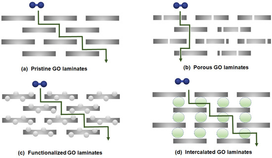 In comparison to a single-layer graphene membrane, the creation of multi-layer stacked graphene is considered to be technically viable, as multi-layer graphene laminates with high-quality and integrity can be readily developed less stringently in membrane design. To date, the utilization of multi-layer graphene for gas separation commonly involves the synthesis of GO, which is one of the main derivatives of graphene. This is attributed to its well-established synthesis method (graphite oxidation), as well as the presence of abundant functional groups on the basal and edge of graphene planes (e.g., epoxy, carboxyl and hydroxyl). As these hydrophilic functional groups allow GO to be dispersed stably in polar solvents such as water, GO can be processed into thin films and membranes. However, the development of a defect-free continuous film is necessary in order to prevent the undesirable nonselective transport of gases. This is typically accomplished by increasing the thickness of GO laminates. Nevertheless, such action leads to a compromise in gas permeability (or flux), as depicted by the Hagen-Poiseuille equation [60]. Besides, according to the calculations by Nielsen [61], if the graphene sheets are oriented perpendicular to the permeation direction, the diffusion length is expected to be 1450 times greater, with respect to the thickness of the graphene laminates (Figure 3a). Thus, various strategies such as porous graphene laminates (Figure 3b), functionalized GO laminates (Figure 3c) or intercalated GO laminates (Figure 3d) have been proposed to tune the resulting gas separation performance. The details about the effects of various fabrication processes on H2 separation performance will be discussed in Section 3.1.2.