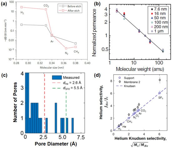(a) Average deflection (-dδ/dt) against molecular size for a bilayer graphene membrane (Bi-3.4 Å). Reprinted with permission from Reference [108], copyright 2012, Nature Publishing Group. (b) The trend of gas permeability (permeance of H2, He, CH4, N2, CO2 and SF6 that is normalized with N2 permeance) for single-layer graphene with various average pore diameters. The solid line on the graph indicates the inverse square root of mass dependence (illustration of Knudsen selectivity). Reprinted with permission from Reference [79], copyright 2014, American Association for the Advancement of Science. (c) Pore size distribution of single-layer graphene measured with the aid of scanning transmission electron microscopy (STEM). (d) Ratio of the helium flow rate to those of other gases that is plotted against Knudsen selectivity. Reprinted with permission from Reference [89], copyright 2017, American Chemical Society.