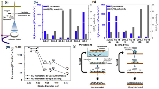 (a) Schematic illustration of the spray evaporation process. Reprinted with permission from Reference [94], copyright 2018, Elsevier. (b) H2 separation performance of GO membranes with variations of the evaporation rate (0.1 to 1, based on the mass fraction of ethanol in an aqueous solution). (c) H2 separation performance of GO membranes with variations of the spraying time (time in this context refers to the number of spray coatings conducted, which is indicated in parentheses). Reprinted with permission from Reference [85], copyright 2017, Elsevier. (d) Comparison of the pure gas permeance of the GO membranes by spin coating and vacuum filtration. Reprinted with permission from Reference [83], copyright 2016, American Chemical Society. (e) Comparison between the GO membranes prepared by method one (contacting the polyethersulfone (PES5) membrane with the GO solution, followed by spin coating) and method two (spin casting). Reprinted with permission from Reference [77], copyright 2013, American Association for the Advancement of Science.