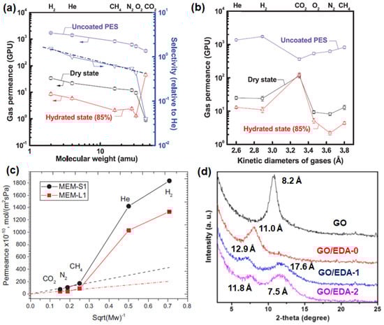 (a) Gas permeation of the GO membranes (method one) as a function of molecular weight (the black dash line corresponds to the ideal Knudsen selectivity). (b) Gas permeation of the GO membranes (method two) as a function of the kinetic diameter. Reprinted with permission from Reference [77], copyright 2013, American Association for the Advancement of Science. (c) Pure gas permeation of MEM-S1. Reprinted with permission from Reference [95], copyright 2018, Elsevier. (d) X-ray diffraction (XRD) profiles of GO, GO/EDA-0, GO/EDA-1 and GO/EDA-2 (0, 1 and 2 refer to the crosslinking time in hours). Reprinted with permission from Reference [90], copyright 2018, American Chemical Society.