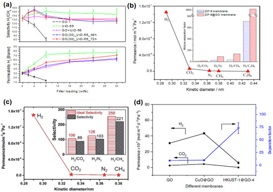 (a) Performance of the mixed-matrix membrane (MMM) with the incorporation of GO, UiO-66 and UiO-66/GO composites (GO_UiO-66) and the physical blending of GO and UiO-66 (GO + UiO-66). Reprinted with permission from Reference [105], copyright 2017, Elsevier. (b) Single-gas permeance (at 250 °C) of the ZIF-8@GO membrane as a function of the kinetic diameter. The inset includes the selectivities of the ZIF-8 and ZIF-8@GO membranes. Reprinted with permission from Reference [80], copyright 2014, American Chemical Society. (c) Single-gas permeance of the GO-Zn2(bim)4 membrane. The inset includes the ideal and mixed-gas selectivities. Reprinted with permission from Reference [93], Creative Commons Attribution CC BY 4.0. (d) Mixed-gas H2/CO2 separation performance of the GO membrane, CuO@GO membrane and HKUST-1@GO-4 membrane. Reprinted with permission from Reference [92], Creative Commons Attribution CC BY 4.0.