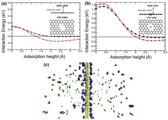 Interaction energy between (a) H2 and (b) CH4 and all-hydrogen passivated porous graphene as a function of the adsorption height. The red and black lines are referring to density functional theory (DFT) calculations conducted by the van der Waals density functional (vdW-DF) and Perdew, Burke and Erzenhoff functional (PBE), respectively. Reprinted with permission from Reference [120], copyright 2009, American Chemical Society. (c) Gas distribution of N2 (green) and H2 (blue) on the porous graphene surface. Reprinted with permission from Reference [121], copyright 2013, American Chemical Society.