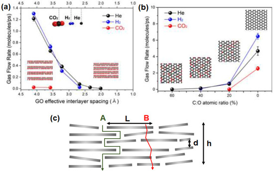 (a) Effect of the change of the interlayer spacing (interlayer carbon-to-carbon system is varied from 4.75 Å to 7.50 Å) on the gas flow rate (gas permeance). (b) Effect of the variation of the oxidation degree (atomic ratio between C and O, in which a higher C:O refers to a higher oxidation degree) on the gas flow rate. Reprinted with permission from Reference [102], copyright 2020, Elsevier. (c) Gas transport model through a multi-layer graphene membrane. Adapted with permission from Reference [95], copyright 2018, Elsevier.