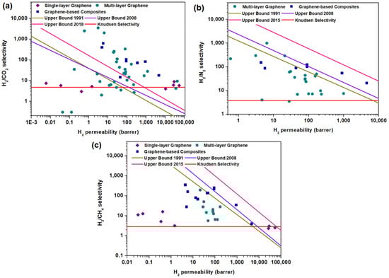 Comparison of the performances of single-layer graphene, multi-layer graphene and graphene-based composites (the data points are obtained from Table 3, Table 4 and Table 5) with the upper-bound limits for (a) H2/CO2, (b) H2/N2 and (c) H2/CH4 separations. The upper-bound curves are determined based on References [28,29,35,129] and summarized in Table 6.
