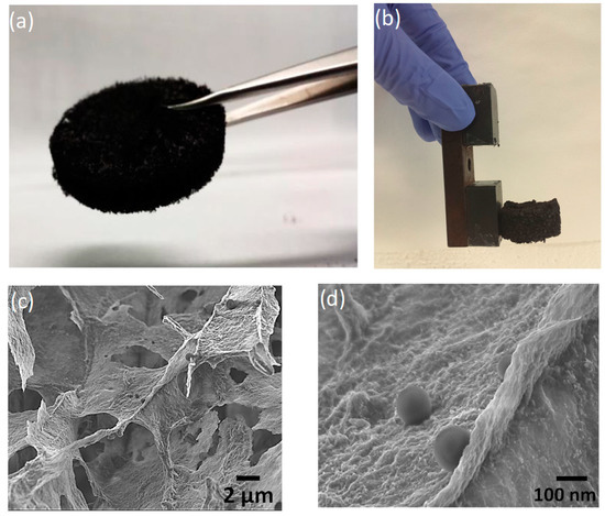 Digital images of the composite foam (a) and the foam in the contact with an external magnet (b). SEM images at different magnifications (c,d).