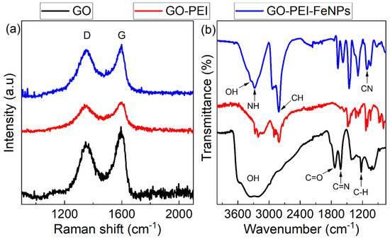 Raman spectra (a) and ATR–FTIR (b) of GO, GO–PEI and GO–PEI–iron nanoparticles (FeNPs).